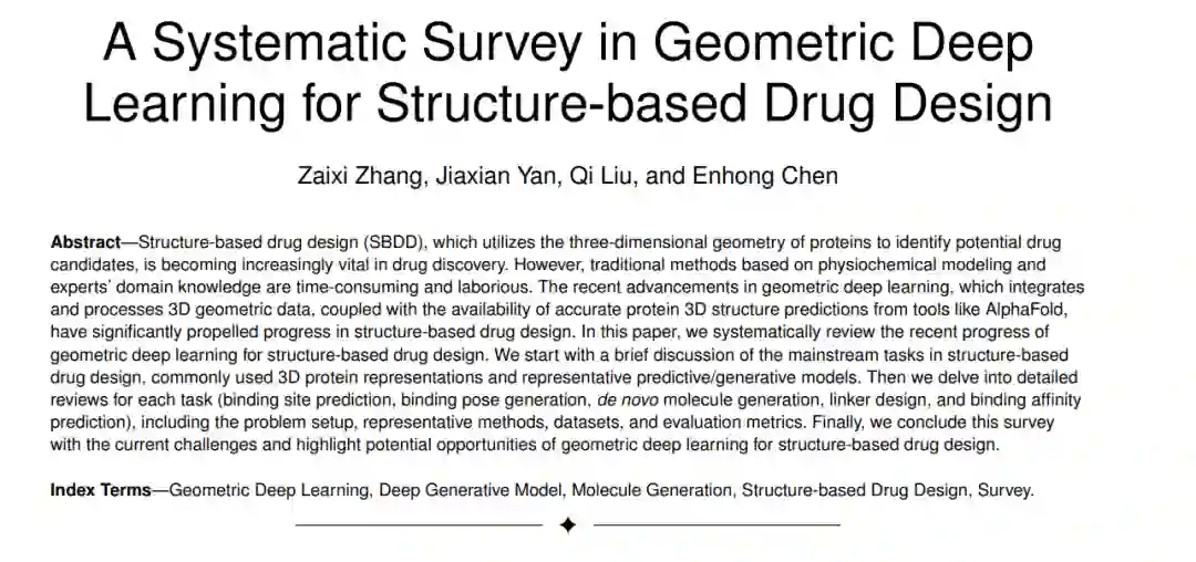 基于结构的药物设计(Structure-based drug design,简称SBDD),利用蛋白质的三维几何结构来识别潜在的药物候选物,正逐渐成为药物发现过程中的重要环节。然而,传统的基于物理化学建模和专家领域知识的方法既耗时又劳动密集。近期,几何深度学习的进步(它整合和处理3D几何数据)以及像AlphaFold这样的工具提供的准确蛋白质3D结构预测的可用性,已经显著推动了基于结构的药物设计的发展。在本文中,我们系统地回顾了几何深度学习在基于结构的药物设计方面的最新进展。我们首先简要讨论了基于结构的药物设计中的主流任务,常用的3D蛋白质表示法,以及具有代表性的预测/生成模型。然后,我们深入探讨了每个任务(包括结合位点预测,结合姿态生成,去新分子生成,连接片设计和结合亲和力预测)的详细评论,包括问题设置,具有代表性的方法,数据集和评估指标。最后,我们总结本文,并讨论了几何深度学习在基于结构的药物设计方面面临的当前挑战,并强调了其潜在机会。