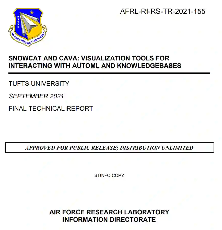 我们在这两方面都取得了成功。我们开发了Snowcat,作为一个完整的集成视觉分析系统与AutoML。在NIST进行的评估中,发现Snowcat帮助领域专家创建的机器学习模型比单独由AutoML生成的模型和由领域专家策划的模型(手动)更准确。对于数据增强,我们开发了CAVA1来帮助领域专家丰富他们的数据。该工具是在线部署的,MITRE的领域科学家发现它有能力帮助领域专家识别和整合来自知识库的新数据,以回答新的分析问题。