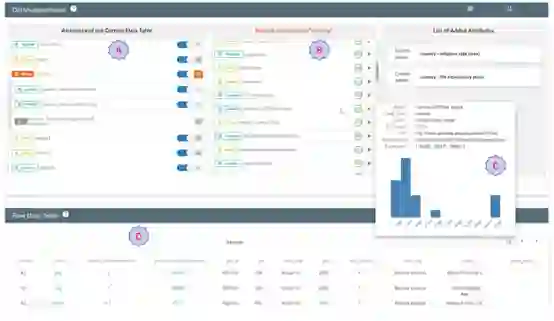 此外,我们还开发了三个可视化界面,以帮助领域专家进行数据增强: a) 基于抽样的数据预览。为了解决提高处理大型数据集的可扩展性,同时尽量减少用户的等待时间的挑战,我们开发了一种基于抽样的方法,为用户提供了用户数据增强操作的近似预览(见图7的D面板)。这种 "基于抽样的预览"延伸到可视化中的许多地方,包括但不限于。(1)对将包括在增强中的数据属性的质量的估计,(2)数据属性的预期分布的可视化,(3)增强后数据中产生的行的例子。如果没有基于抽样的方法,完整的数据集(可能有数百万行)的完整 "join"可能需要几分钟甚至几个小时才能完成。基于抽样的方法将等待时间减少到几秒钟,同时为用户提供了对增强操作和过程进行决策所需的直觉。 b) 一个 "贯穿式连接 "的可视化解释。由于数据增强可能很复杂,特别是当需要连接的数据在知识图谱中存在3个或更多的 "hops"时,我们观察到这些复杂的增强程序会让那些可能不熟悉知识图谱和数据增强过程的用户不知所措。为了帮助缓解使用我们的数据增强工具的困难,我们开发了一个可视化的工具来解释这些复杂的增强过程。通过使用这种可视化的方式,用户可以预览扩增操作,并在投入操作之前进行调整。 c) 对实时迭代建模的支持。由于D3M中数据增强的目的是为了提高所产生的机器学习模型的质量,我们在系统中增加了对建模工具直接整合的支持。具体来说,在我们的系统中,用户可以快速检查新增加的数据特征是否改善了模型(如果没有,可以删除该特征)。系统对模型的迭代(以及用于生成模型的数据特征)进行跟踪,允许用户看到进展情况,并跳回到之前的模型,尝试不同的数据增强想法。