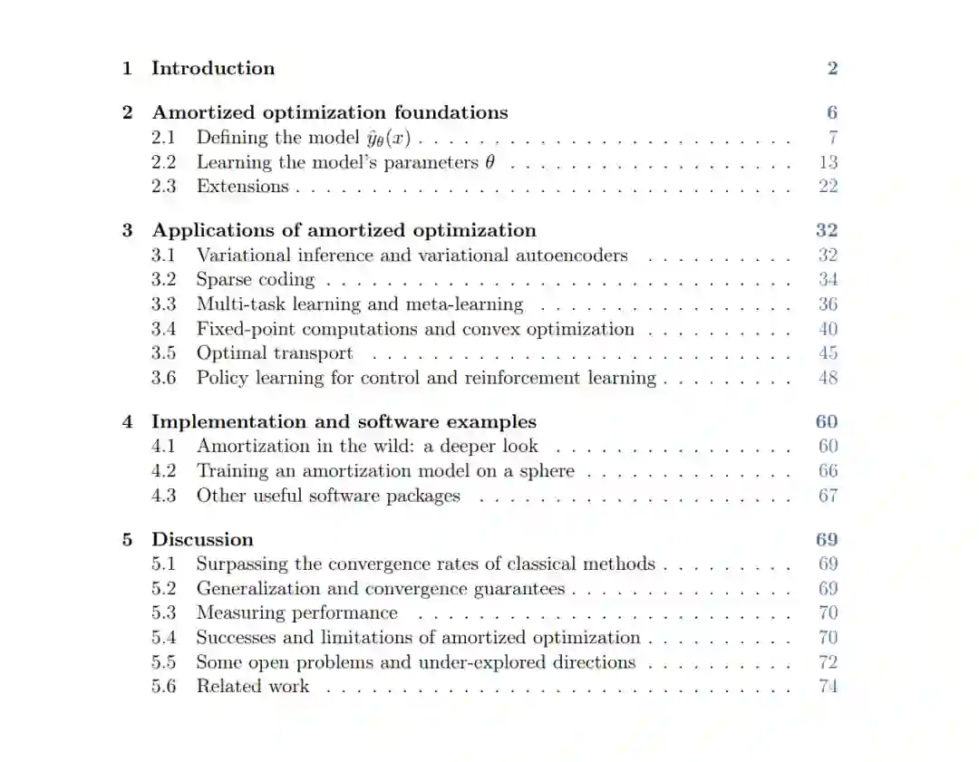 优化是一个无处不在的建模工具,经常用于反复解决同一问题的相似实例的场合。摊销优化方法通过学习来预测这些场景中的问题解决方案,利用相似问题实例之间的共享结构。这些方法在变分推断和强化学习中至关重要,其优化速度比不使用摊销的传统优化方法快许多个数量级。 在这个教程中,作者介绍了这些进步背后的摊销优化基础,并概述了它们在变分推断、稀疏编码、基于梯度的元学习、控制、强化学习、凸优化、最优传输和深度平衡网络中的应用。对读者实际有用的是伴随实现和软件示例章节的源代码。 这个教程为读者提供了一个完整的资源,用于理解和实现许多机器学习应用中的摊销优化背后的理论。无论是学生还是从业者都会对此感兴趣。