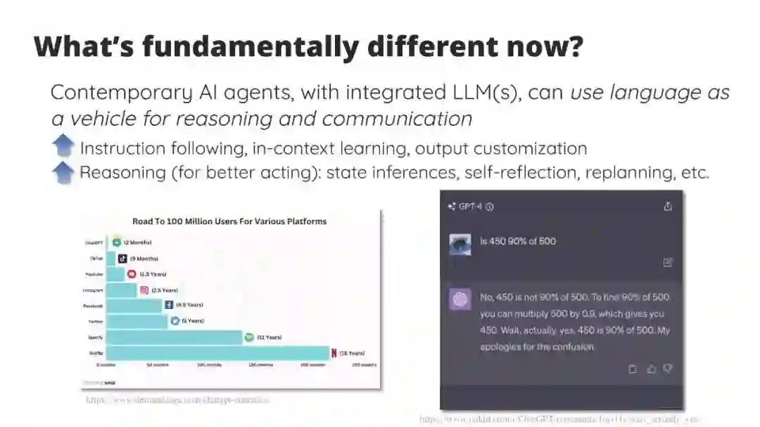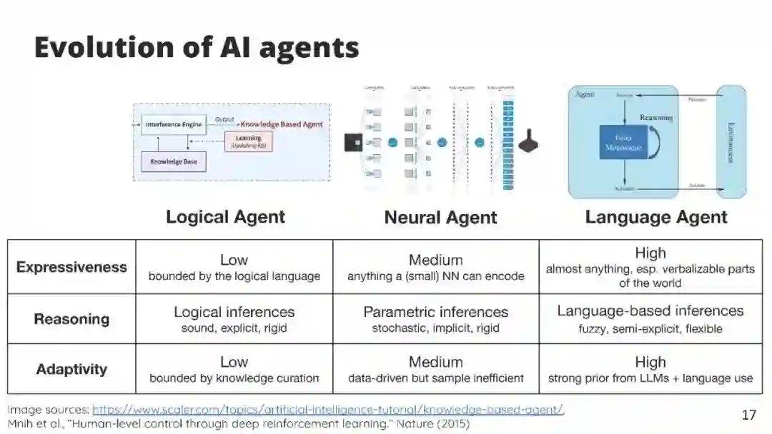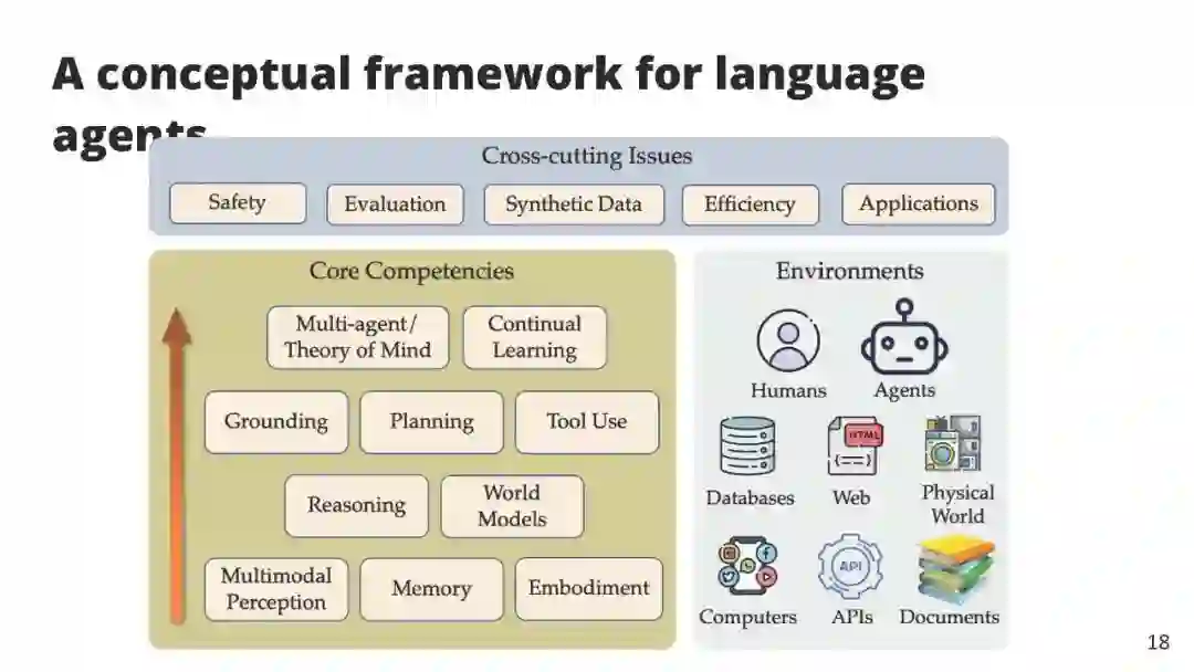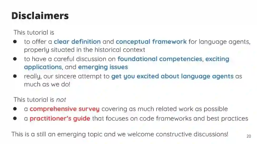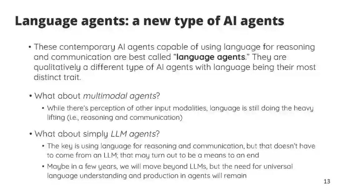 在过去的一年中,基于大型语言模型(LLMs)的AI智能体迅速成为最令人兴奋但也颇具争议的话题之一。有人认为这是下一次技术革命的开端,而另一些人则认为这些智能体不过是LLMs的简单包装。在本教程中,我们希望认真审视并调和这些不同的观点,同时将新一代AI智能体放在更广泛的AI发展历史中进行合理定位。我们认为,当代AI智能体与以往几代(如逻辑智能体或神经网络智能体)在质量上存在显著差异。通过集成LLM,这些智能体获得了一种全新的能力,即利用语言作为推理和交流的媒介,从而大幅提升了它们的表达能力和适应性。因此,我们认为它们最适合被称为语言智能体,因为语言是它们最显著的特性。 语言在推动人类认知进化中起到了关键作用,而AI似乎也在沿着类似的路径前进。然而,目前针对语言智能体的定义、理论基础、应用、风险及未来方向的系统性讨论仍然较少。本前沿教程旨在填补这一空白,提供对语言智能体的全面探讨。
