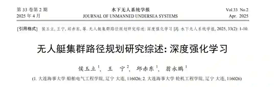 摘 要: 无人艇(USV)集群在复杂海洋任务中展现出显著优势, 但其路径规划面临高维、动态、多约束等挑 战。传统路径规划算法因协同机制薄弱与适应性不足, 难以满足日渐复杂的需求,而深度强化学习(DRL)技术 的发展为 USV 集群路径规划提供了新的研究方向。文中系统综述了基于 DRL 的 USV 集群协同路径规划技 术框架及典型算法。首先, 梳理了 USV 集群路径规划的技术演进脉络与多维约束条件, 分析了集中式和分布 式决策框架的适用场景与局限性。其次, 探讨了多种典型 DRL 算法的原理、应用场景及改进方向, 分析了其 优势与不足。最后, 总结了该领域面临的主要挑战和发展方向, 旨在为基于 DRL 的 USV 集群协同路径规划 研究提供参考。