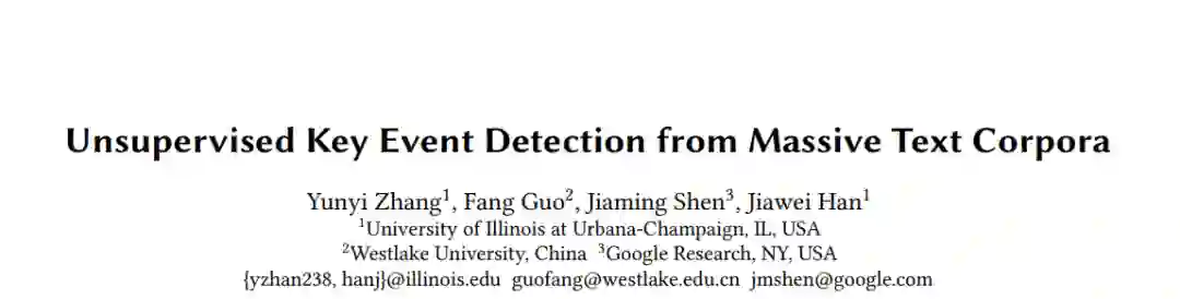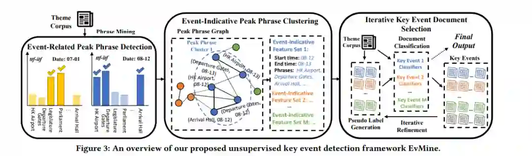 从新闻语料库中自动检测事件是挖掘快速进化的结构化知识的关键。由于现实世界的事件具有不同的粒度,从顶级主题到关键事件,再到与具体行动相对应的事件提及,通常有两种研究方向:(1)主题检测从新闻语料库中识别出主要主题(如“2019年香港抗议”vs.;“2020年美国总统选举”),语义非常明确;(2)动作抽取(action extraction)从一个文档提及级别的动作(例如,“警察打了抗议者的左臂”)中提取,这些动作粒度太细,无法理解事件。在本文中,我们提出了一个新的任务,即中间层次的关键事件检测,旨在从一个新闻语料库中检测出发生在特定时间/地点、关注同一主题的关键事件(如“8月12-14日香港机场抗议”)。由于关键事件的主题和时间的紧密性,以及由于新闻文章的快速发展而导致标记数据的稀缺,这一任务可以将事件理解和结构连接起来,并且具有内在的挑战性。为了应对这些挑战,我们开发了一个无监督的关键事件检测框架EvMine,该框架(1)使用一种新的ttf-itf评分提取时间频繁的峰值短语,(2)通过从我们设计的峰值短语图中检测社区,将峰值短语合并到事件指示性特征集,该图捕捉文档共现、语义相似性和时间紧密性信号,(3)通过从事件指示性特征集自动生成伪标签训练分类器,并使用检索到的文档细化检测到的关键事件,迭代检索与每个关键事件相关的文档。大量的实验和案例研究表明,EvMine在两个真实世界的新闻语料库上优于所有的基线方法和它的改进。