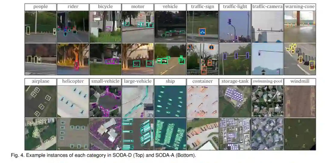 考虑到上述问题,我们构建了两个大型小目标检测数据集SODA, SODA- D和SODA- A,分别针对驾驶场景和空中场景。提出的SODAD建立在MVD[33]和我们的数据之上,其中前者是一个专门用于街道场景像素级理解的数据集,而后者主要由车载摄像头和手机捕获。利用24704张精心挑选的高质量驾驶场景图像,我们用水平边框标注了9个类别的277596个实例。SODA-A是专门用于空中场景下的小目标检测任务的基准测试,它在9个类中有800203个实例,具有面向矩形框注释。它包含了2510张从谷歌地球提取的高分辨率图像。