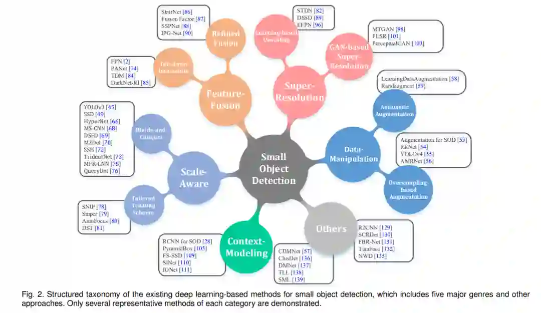 小物体的特征表示质量不高的原因是它们的尺寸有限和一般的特征提取范式。具体而言,目前流行的特征提取器[10],[11],[12]通常对特征映射进行下采样,以减少空间冗余和学习高维特征,这不可避免地会减少微小物体的表示。而且小目标的特征在卷积处理后容易被背景等实例污染,使得网络难以捕捉到对后续任务至关重要的判别性信息。针对这一问题,研究人员提出了一系列的工作,可分为6类: 数据操作方法、尺度感知方法、特征融合方法、超分辨率方法、上下文建模方法和其他方法。我们将在综述部分详尽地讨论这些方法,并将提供深入的分析。