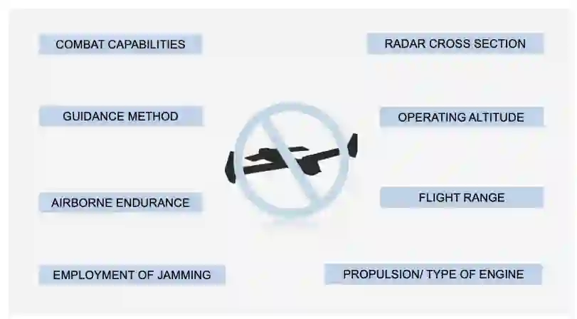 现代战争中使用的无人飞行器设计多种多样,因此在构建和运行反无人机系统时必须考虑各种因素。其中,应始终考虑无人飞行器的以下特征:推进力、有效雷达截面、制导方式、作战上限、飞行距离、空中续航时间、预期目的、作战能力(包括收集情报、携带和发射有效载荷的能力)以及电磁干扰对策。