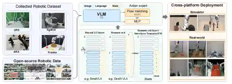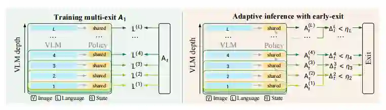 A₁最核心的价值,是同时解决了 VLM 骨干笨重、动作头迭代缓慢两大行业难题,实现真正的端到端加速。 模型采用动作一致性早退出机制,训练时让 VLM 每一层都连接动作头,推理时逐层对比动作差异,达到阈值立即停止计算,简单任务浅层即可完成,复杂任务再深入深层。针对早退出可能导致动作头变瓶颈的问题,团队创新提出层间截断流匹配,将去噪步数大幅压缩,并且让下一层动作生成直接承接上一层结果热启动,无需从噪声重新初始化,像接力一样连贯生成动作,彻底消除冗余计算。