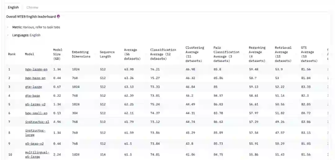 * BGE[17] 模型: 由智源研究院开源的中英文语义向量模型,目前在MTEB中英文榜单都排在第一位。