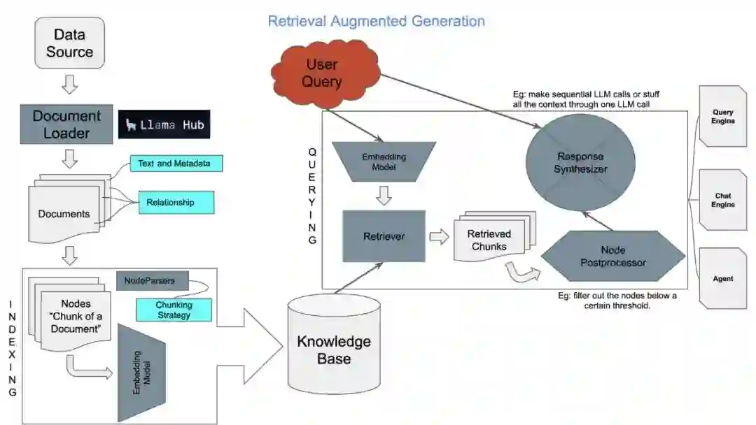 检索模块基于用户查询检索出相关的文本块,回复生成模块让 LLM 利用检索出的相关信息来生成对原始查询的回复。LlamaIndex 中有给出一些不同的回复生成策略。