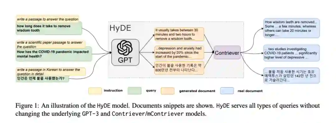 HyDE[32],全称叫 Hypothetical Document Embeddings,给定初始查询,首先利用 LLM 生成一个假设的文档或者回复,然后以这个假设的文档或者回复作为新的查询进行检索,而不是直接使用初始查询。这种转换在没有上下文的情况下可能会生成一个误导性的假设文档或者回复,从而可能得到一个和原始查询不相关的错误回复。下面是论文中给出的一个例子: