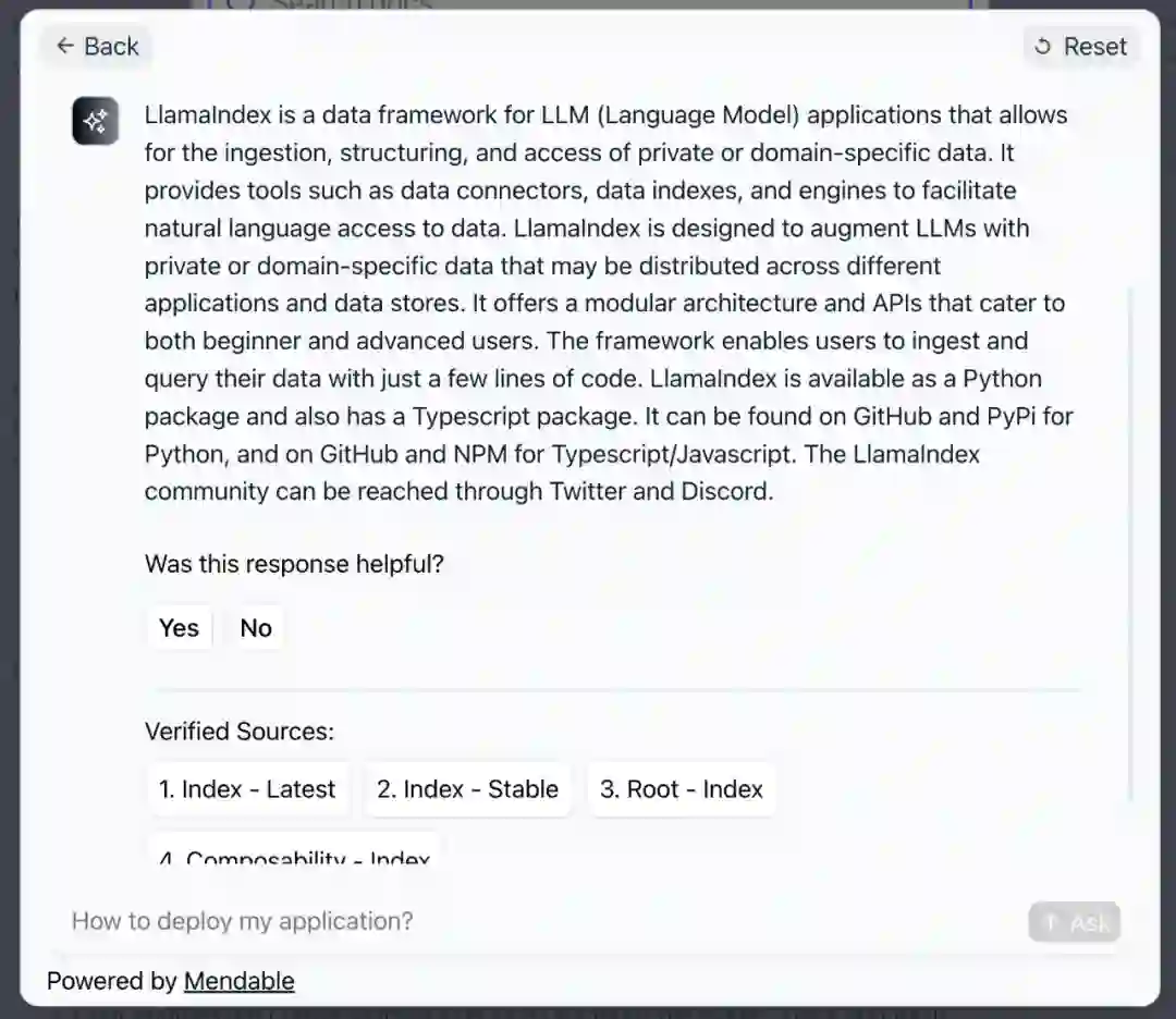 检索增强 LLM 技术的一个典型应用是知识库或者文档问答,比如针对企业内部知识库或者一些文档的检索与问答等。这个应用方向目前已经出现了很多商业化和开源的产品。比如 Mendable[42] 就是一款商业产品,能提供基于文档的 AI 检索和问答能力。上面提到的 LlamaIndex 和 LangChain 项目官方文档的检索能力就是由 Mendable 提供的。下面就是一张使用截图,可以看到 Mendable 除了会给出生成的回复,也会附上参考链接。