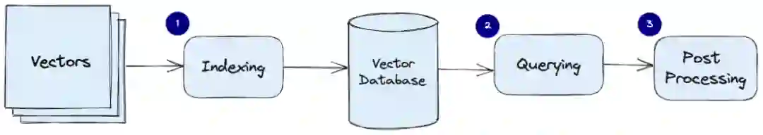 所以向量数据库应运而生。简单来说,向量数据库是一种专门用于存储、管理和查询向量数据的数据库,可以实现向量数据的相似检索、聚类等。目前比较流行的向量数据库有 Pinecone[23]、Vespa[24]、Weaviate[25]、Milvus[26]、Chroma[27] 、Tencent Cloud VectorDB[28]等,大部分都提供开源产品。 Pinecone 的这篇博客 What is a Vector Database[29] 就对向量数据库的相关原理和组成进行了比较系统的介绍,下面这张图就是文章中给出的一个向量数据库常见的数据处理流程: