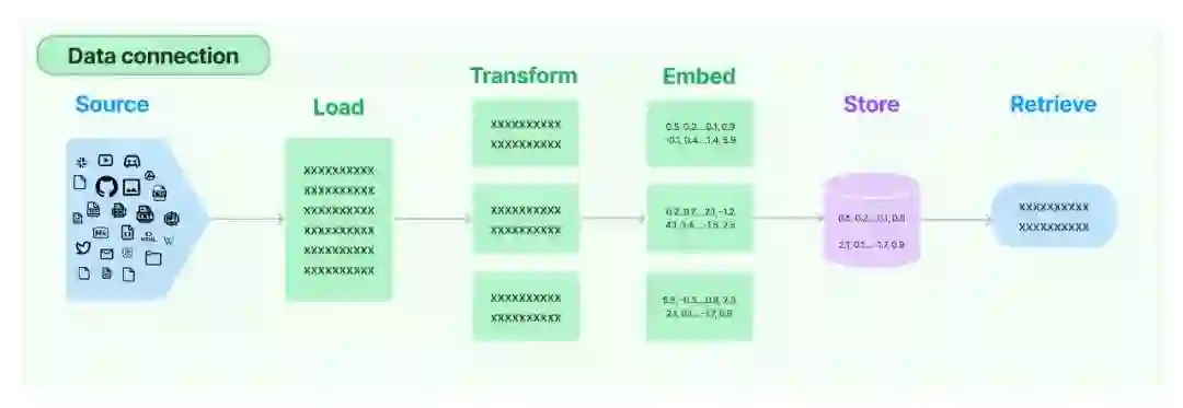 除了 LlamaIndex,LangChain[37] 也是当前流行的一种 LLM 应用开发框架,其中也包含一些检索增强 LLM 的相关组件,不过相比较而言,LlamaIndex 更侧重于检索增强 LLM 这一相对小的领域,而 LangChain 覆盖的领域更广,比如会包含 LLM 的链式应用、Agent 的创建和管理等。下面这张图就是 LangChain 中 Retrieval[38] 模块的整体流程示意图,包含数据加载、变换、嵌入、向量存储和检索,整体处理流程和 LlamaIndex 是一样的。