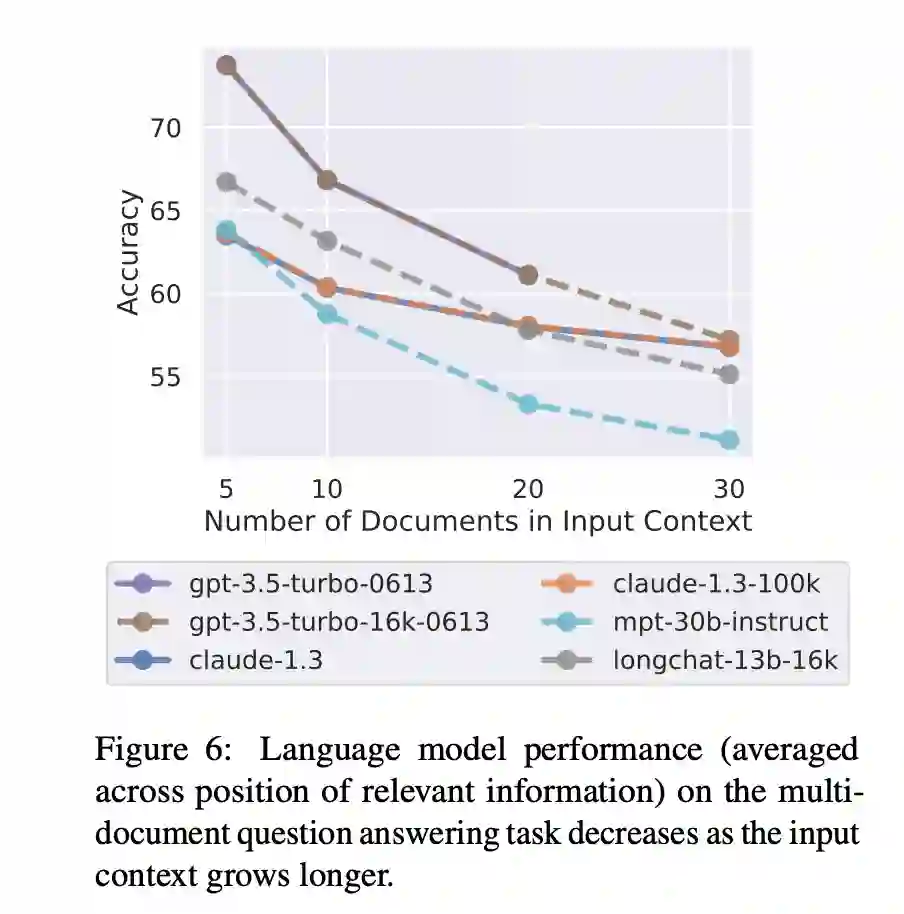 利用检索来增强 LLM 的输出,其中很重要的一步是通过一些检索相关的技术从外部数据中找出相关信息片段,然后把相关信息片段作为上下文供 LLM 在生成回复时参考。有人可能会说,随着 LLM 的上下文窗口 ( Context Window ) 越来越长,检索相关信息的步骤是不是就没有必要了,直接在上下文中提供尽可能多的信息。比如 GPT-4 模型当前接收的最大上下文长度是 32K, Claude 模型最大允许 100K[9] 的上下文长度。 虽然 LLM 的上下文窗口越来越大,但检索相关信息的步骤仍然是重要且必要的。一方面当前 LLM 的网络架构决定了其上下文窗口的长度是会有上限的,不会无限增长。另外看似很大的上下文窗口,能容纳的信息其实比较有限,比如 32K 的长度可能仅仅相当于一篇大学毕业论文的长度。另一方面,有研究表明,提供少量更相关的信息,相比于提供大量不加过滤的信息,LLM 回复的准确性会更高。比如斯坦福大学的这篇论文 Lost in the Middle[10] 就给出了下面的实验结果,可以看到 LLM 回复的准确性随着上下文窗口中提供的文档数量增多而下降。