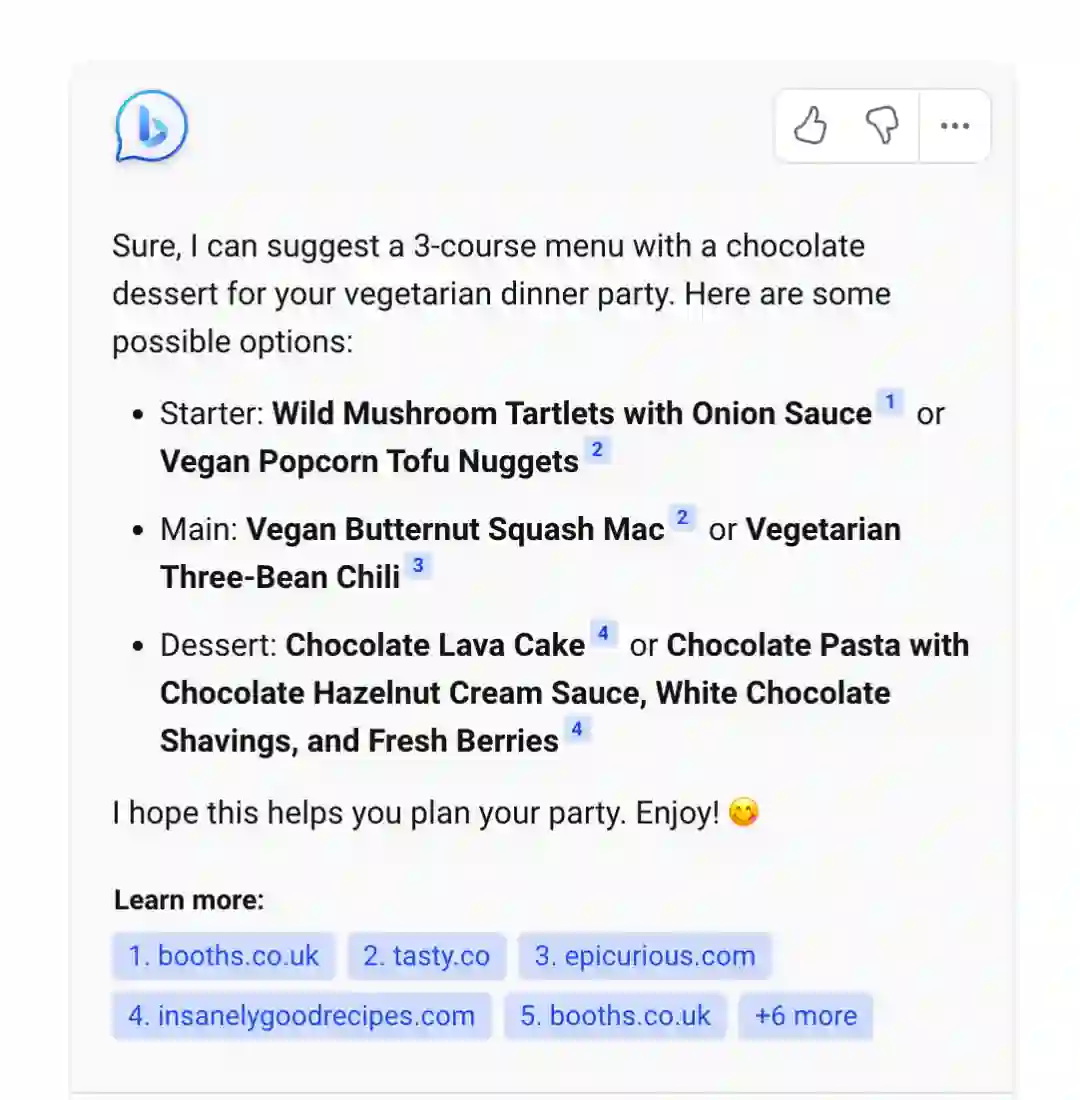 通常情况下,LLM 生成的输出不会给出其来源,比较难解释为什么会这么生成。而通过给 LLM 提供外部数据源,让其基于检索出的相关信息进行生成,就在生成的结果和信息来源之间建立了关联,因此生成的结果就可以追溯参考来源,可解释性和可控性就大大增强。即可以知道 LLM 是基于什么相关信息来生成的回复。Bing Chat 就是利用检索来增强 LLM 输出的典型产品,下图展示的就是 Bing Chat 的产品截图,可以看到其生成的回复中会给出相关信息的链接。