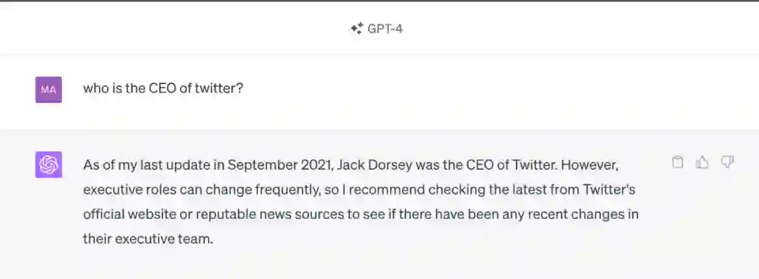 由于 LLM 中学习的知识来自于训练数据,虽然大部分知识的更新周期不会很快,但依然会有一些知识或者信息更新得很频繁。LLM 通过从预训练数据中学到的这部分信息就很容易过时。比如 GPT-4 模型使用的是截止到 2021-09 的预训练数据,因此涉及这个日期之后的事件或者信息,它会拒绝回答或者给出的回复是过时或者不准确的。下面这个示例是问 GPT-4 当前推特的 CEO 是谁,GPT-4 给出的回复还是 Jack Dorsey,并且自己会提醒说回复可能已经过时了。