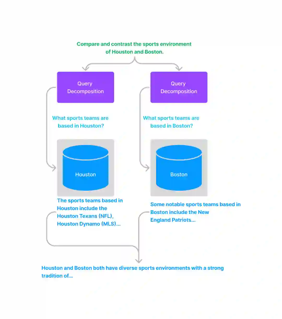 对于**多步分解**,给定初始的复杂查询,会一步一步地转换成多个子查询,结合前一步的回复结果生成下一步的查询问题,直到问不出更多问题为止。最后结合每一步的回复生成最终的结果。