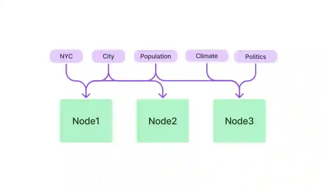 关键词表索引从每个节点中提取关键词,构建了每个关键词到相应节点的多对多映射,意味着每个关键词可能指向多个节点,每个节点也可能包含多个关键词。在检索阶段,可以基于用户查询中的关键词对节点进行筛选。