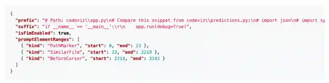 下面是一个 Prompt 的示例,可以看到包含前缀代码信息 ( prefix ),后缀代码信息 ( suffix ),生成模式 ( isFimEnabled ),以及 Prompt 不同组成元素的起始位置信息 ( promptElementRanges )。