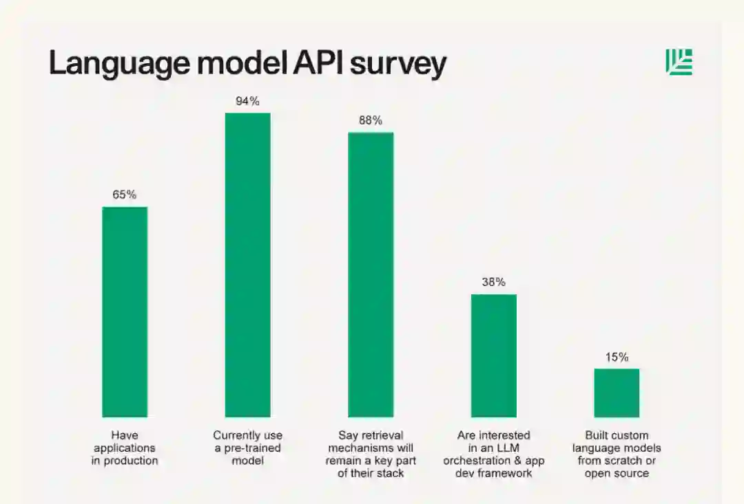 传统的信息检索工具,比如 Google/Bing 这样的搜索引擎,只有检索能力 ( Retrieval-only ),现在 LLM 通过预训练过程,将海量数据和知识嵌入到其巨大的模型参数中,具有记忆能力 ( Memory-only )。从这个角度看,检索增强 LLM 处于中间,将 LLM 和传统的信息检索相结合,通过一些信息检索技术将相关信息加载到 LLM 的工作内存 ( Working Memory ) 中,即 LLM 的上下文窗口 ( Context Window ),亦即 LLM 单次生成时能接受的最大文本输入。 不仅 Andrej 的分享中提到基于检索来增强 LLM 这一应用方式,从一些著名投资机构针对 AI 初创企业技术栈的调研和总结中,也可以看到基于检索来增强 LLM 技术的广泛应用。比如今年6月份红杉资本发布了一篇关于大语言模型技术栈的文章 The New Language Model Stack[4],其中就给出了一份对其投资的33家 AI 初创企业进行的问卷调查结果,下图的调查结果显示有 88% 左右的创业者表示在自己的产品中有使用到基于检索增强 LLM 技术。