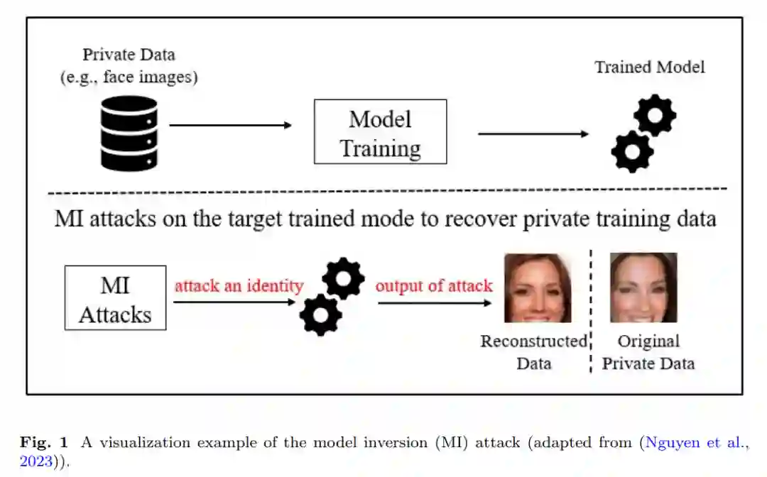 1.1 背景随着深度学习模型在敏感应用中的日益集成,强大的隐私和安全措施变得至关重要。尽管深度学习机制提供了前所未有的预测准确性,但它也带来了与模型如何编码和保留训练数据相关的漏洞(Rigaki 和 Garcia, 2023;Sen 等, 2024)。复杂的架构,如卷积神经网络(CNN)和变换器,通常在泛化能力上表现出色,但可能会不经意地记住训练数据的细节。在隐私敏感的应用中,这种记忆可能构成重大风险,因为关于训练数据的间接推断可能会导致严重后果。在威胁深度学习系统的主要攻击(例如,模型提取、模型反演(MI)、数据投毒和对抗攻击)中(He 等, 2020),MI 攻击由于能够从训练数据集中提取敏感信息并破坏用户隐私而尤为突出(Gong 等, 2023)。MI 攻击由 Fredrikson 等人(Fredrikson 等, 2014)提出,利用输入数据和模型学习参数之间的关系来恢复敏感信息。MI 攻击的影响不仅仅是侵犯个人隐私,它还破坏了对机器/深度学习系统在关键应用中的信任,如生物识别、医疗保健分析和金融建模。例如,在人脸识别系统中使用 MI 攻击,攻击者可以近似训练数据集中的面部特征并重建人脸图像,从而破坏生物识别系统的安全性(Yang 等, 2023;Tran 等, 2024;Qiu 等, 2024)。在医疗保健系统中,泄露的敏感患者数据可能违反伦理标准并导致法律后果(Dao 和 Nguyen, 2024)。类似地,在金融系统中,私人交易数据或信用评分可能会受到 MI 攻击的影响(Milner, 2024)。除了隐私问题外,这些攻击还可能削弱用户对机器/深度学习系统的信任,因为用户可能失去对其个人或敏感信息安全性的信心。图1展示了 MI 攻击的可视化示例。从技术角度来看,MI 攻击利用深度学习模型固有的脆弱性,即过拟合或记忆训练数据中的模式(Titcombe 等, 2021)。研究人员已集中精力了解加剧这种脆弱性的因素,并开发稳健的防御机制。影响 MI 攻击成功的因素有几个(Fredrikson 等, 2015;Shokri 等, 2017)。首先,访问模型:攻击者需要访问模型的输出、架构或参数。在白盒场景中,攻击者对模型有完全的了解,包括其架构和参数,而在黑盒场景中,攻击者只能访问输出。其次,模型架构:不同的模型保留关于训练数据的不同信息量。复杂的模型,如深度神经网络(DNN),特别容易受到 MI 攻击,因为它们更可能记住并存储关于输入的详细信息。第三,数据相关性:MI 攻击通常利用输入数据和模型输出之间的相关性。通过了解输入的小变化如何影响模型输出,攻击者可以微调原始数据的重建。防御 MI 攻击提出了独特的挑战。首先,设计防御策略需要平衡模型的效用和预测能力与减少隐私保护机制的风险。其次,MI 攻击通常只需要有限的信息,如访问模型输出或中间特征,而不是完全访问模型参数或训练数据(Han 等, 2023;Fang 等, 2023b)。因此,防止这些攻击并非易事。此外,隐私保护技术往往会降低模型性能,因此需要在准确性和隐私之间进行仔细的权衡。MI 攻击突显了深度学习模型中的一个关键漏洞,强调了需要强有力的防护措施来保护敏感信息。本综述探讨了 MI 攻击的分类,并审视了为减轻这些威胁而提出的防御策略。1.2 现有的 MI 攻击与防御综述已有一些关于 MI 攻击和防御的综述,提供了关于这种隐私威胁的机制、挑战和对策的宝贵见解。这些综述总结如下。Zhang 等人(Zhang 等, 2022)发现,通过名为梯度反演(GradInv)攻击的技术,可以从梯度中重建训练样本。这些攻击展示了攻击者如何利用梯度数据危害数据隐私。作者将 GradInv 攻击分为两种主要模式(即基于范式迭代和基于递归的方法),并突出了梯度匹配和数据初始化等关键技术,以优化恢复过程。Dibbo(Dibbo, 2023)对 MI 攻击进行了系统的综述,提供了一种分类法,将 MI 攻击根据不同的方法和特征进行分类。该分类法突出了 MI 攻击与其他隐私威胁(如模型提取和成员推理)相比的独特性质,将 MI 攻击定位为具有独特复杂性和影响的攻击。作者还概述了关键的防御策略,并提出了若干开放性问题。Yang 等人(Yang 等, 2023)对联邦学习(FL)中的梯度泄漏攻击进行了深入研究,并将这些攻击分为基于优化的攻击和基于分析的攻击。前者将数据重建视为优化问题,而后者通过线性方程分析来解决问题。为了克服这些传统方法的局限性,作者提出了一种新型的基于生成的范式,大大提高了重建的准确性和效率。