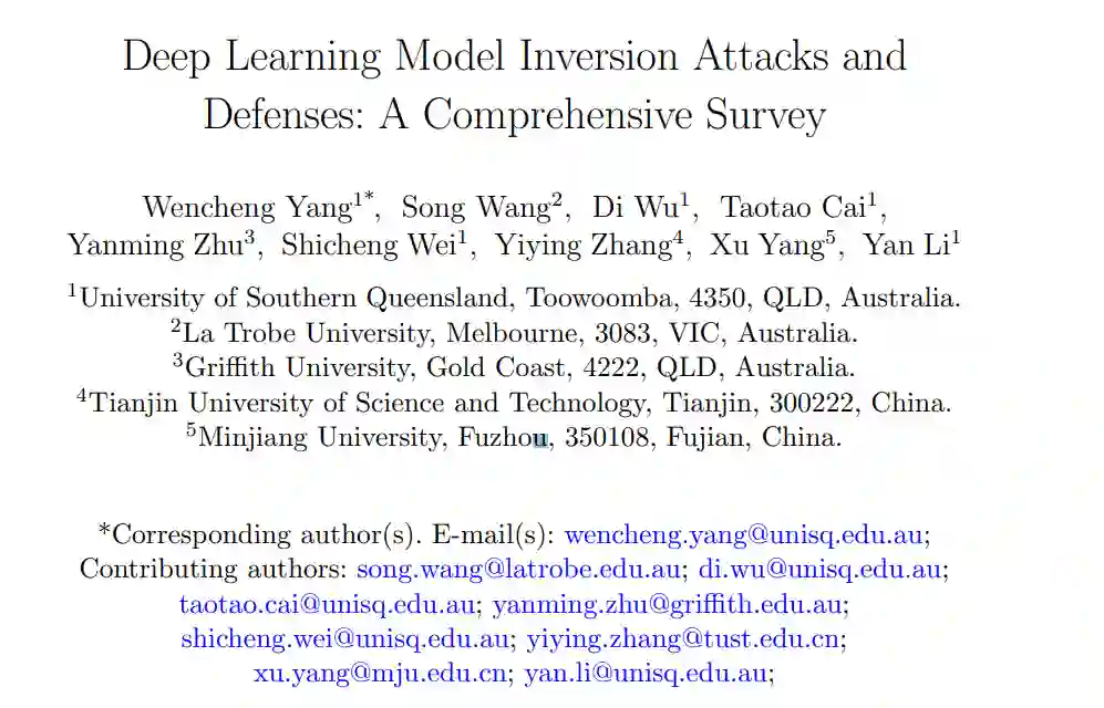 深度学习在敏感领域的迅速应用带来了巨大的好处。然而,这种广泛的应用也带来了严重的漏洞,尤其是模型反演(MI)攻击,这对个人数据的隐私性和完整性构成了重大威胁。这些攻击在生物识别、医疗保健和金融等应用中的日益普及,促使人们迫切需要了解其机制、影响和防御方法。本综述旨在填补文献中的空白,通过提供关于MI攻击和防御策略的结构化且深入的回顾。我们的贡献包括MI攻击的系统分类、对攻击技术和防御机制的广泛研究,以及对这一发展中的领域面临的挑战和未来研究方向的讨论。通过探讨MI攻击的技术性和伦理性影响,本综述旨在提供对AI驱动系统对隐私、安全和信任影响的深入见解。与本综述相结合,我们还开发了一个全面的资源库,以支持MI攻击和防御的研究。该资源库包括最前沿的研究论文、数据集、评估指标和其他资源,以满足对MI攻击和防御以及更广泛的AI安全与隐私领域感兴趣的初学者和经验丰富的研究人员的需求。该资源库将持续维护,以确保其相关性和实用性。资源库可以通过以下链接访问:https://github.com/overgter/DeepLearning-Model-Inversion-Attacks-and-Defenses。关键词:深度学习,模型反演(MI)攻击,隐私,安全