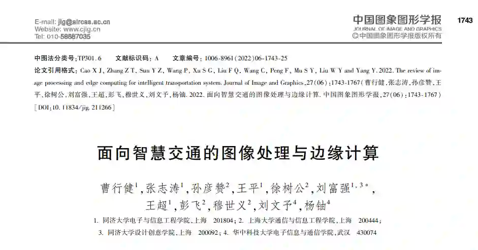 近年来,世界各国均非常重视智慧交通的发展。美国自 2010 年确立了全面推进多模式车联网综合 运输一体化发展的战略主题后,美国智慧交通系统 联合计划办公室于2020 年发布了《智慧交通系统战 略规划 2020—2025》,强调了由自动驾驶和智能网 联单点突破到新兴科技全面创新的布局。中国则在 2019 年,由中共中央、国务院印发了《交通强国建设 纲要》,其中强调大力发展智慧交通,明确了大数 据、互联网、人工智能、区块链和超级计算等新技术 与交 通 行 业 深 度 融 合 的 战 略 部 署 ( http:/ / www. gov. cn / gongbao / content / 2019 / content_5437132. htm)。经过各国多年来在智慧交通领域的大力部署与 发展,智慧交通系统已拥有了广泛的应用与服务。根据应用主体与发展重点的不同,主要可分为 3 大 类别:智慧交通管理、辅助驾驶与自动驾驶以及车路 协同。其中,面向智慧交通管理的应用主要由大量 部署在道路上的智慧交通设施支撑,以实现交通管 理的智能化,其应用主要包括:交通信息采集、车牌 识别和车辆违章检测等。面向辅助驾驶与自动驾驶 的应用则主要以单车智能为主体,依靠视觉感知、雷 达感知、定位系统、车载计算以及人工智能的协同合 作,让车辆智能地辅助人类,或自动安全地行驶。面 向车路协同的应用则是依托于智能车辆、智能路侧 设备和云控平台的协同工作,以车联网为技术支撑, 全方位实施车车、车路和车云动态实时信息交互,进 而实现车辆主动安全控制和道路协同管理,保证交 通安全,提高通行效率( Tian 等,2014)。智慧交通 的实现,需要融合通信、计算与控制等领域的大量先 进技术。其中,图像处理技术作为智慧交通中感知监控、调度和分析的基础,一直以来都是智慧交通系 统的核心技术与前沿发展领域。尤其近年来,随着 计算机视觉技术的不断发展,图像分析已成为推动 智慧交通发展的关键技术之一,是智慧交通的重要 组成部分(Gudigar 等,2016)。图像处理是指借助 计算机算法对图像进行增强与复原、检测与识别以 及分割等处理,以期达到所需目的。其具有精度高、 再现性好、处理多样性和易于控制等优势,在多领域 获得了广泛的应用。将图像分析应用于交通领域, 可以加速交通的智能化进程,极大方便人们出行,降 低交通事故发生(Deng 等,2017)。智慧交通领域涉 及的图像分析任务很多,如基于智能导航的道路识 别、避障和道路节点规划(Kuang 等,2017)以及基于 交通监控的车辆识别与跟踪、交通标志牌识别(Zhao 等,2017)等。通过这些方法,可以将人、车和路全方 位结合,针对交通要素建立一套完整、实时、高效和准 确的数字化交通底座,为智慧交通管理、自动驾驶和 辅助驾驶以及车路协同提供重要的技术保障。