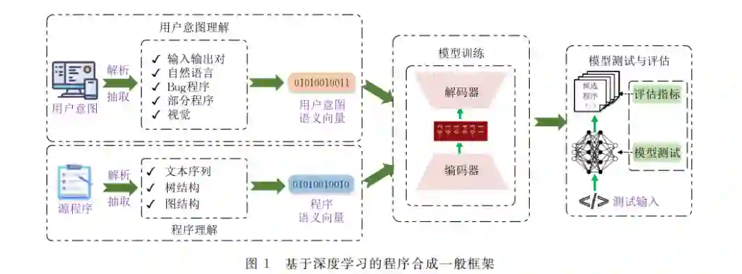 要 随着软件工程实践的不断深入、开源社区的蓬勃发展,基于深度学习的程序合成引起了学术界和工业界 的广泛关注.基于深度学习的程序合成,即程序智能合成,旨在利用深度学习技术自动生成满足用户意图的程序. 相较于传统合成方法在扩展性和实用性方面的局限性,程序智能合成凭借其易扩展、可学习迭代等特性,已迅速崭 露头角,成为软件工程领域的研究热点之一.最近,研究学者们在程序智能合成方面取得了显著进展,如 GPT-4在 LeetCode网站上的表现已经可以与人类相媲美.同时,工业界也推出了多款 AI编程助手,如 Copilot、Comate等,旨 在解决软件开发的产能瓶颈.本文从多个角度出发,包括用户意图理解、程序理解、模型训练、模型测试与评估,归 纳梳理了程序智能合成的研究进展,综述了该领域近几年的研究成果.此外,本文还对可能面临的挑战进行了探 讨,并展望了未来的发展趋势.本文的研究有助于研究学者们全面了解程序智能合成领域的最新研究进展,同时也 有助于软件开发人员快速掌握程序智能合成的技术方案和思路,以满足工业实践的需要。