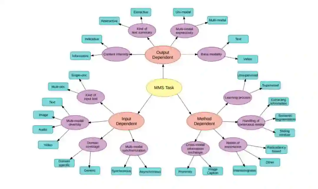 由于技术的进步,人们可以方便地以多种方式创建和共享信息,这在十年前是不可能的。由于这种进步,对多模态摘要的需求正在增加。我们提出了一项调研,以帮助熟悉用户的工具和技术目前的MMS任务。在这份手稿中,我们正式定义了多模态摘要的任务,我们还根据各种输入、输出和技术相关的细节,对现有的作品进行了广泛的分类。然后,我们包括用于处理MMS任务的数据集的全面描述。此外,我们还简要描述了用于解决MMS任务的各种技术,以及用于判断产生的摘要质量的评价指标。最后,本文还提出了MMS研究的几个可能方向。我们希望这篇调研论文能够对多模态摘要的研究起到重要的推动作用。