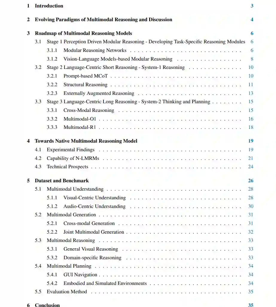 在此发展路径的基础上,我们提出了“原生大型多模态推理模型(Native Large Multimodal Reasoning Models,N-LMRMs)”的概念,这一前瞻性范式不再依赖于将推理能力附加在语言模型之上,而是使推理能力自然而然地从全模态感知、交互以及目标驱动的认知中涌现。 基于统一表示、训练数据合成、从世界经验中学习与基准构建等方面的最新进展,我们进一步探讨了突破当前架构限制、推动多模态智能发展的可能路径。 我们的主要贡献如下: * 本文系统梳理了大型多模态推理模型(LMRMs)的研究全貌,涵盖540余篇相关文献,并分析了当前模型在推理方面的主要限制(第2节); * 我们提出了一个三阶段的发展路线图,从模块化推理到多模态思维链(MCoT),再到支持长程推理的System-2模型,并对各阶段进行了详细的分类分析与代表方法归纳(第3节); * 我们首次引入并分析了“原生大型多模态推理模型(N-LMRMs)”的概念,对其体系结构、学习方法、数据集与基准进行了深入探讨,为未来多模态代理性推理提供了方向(第4节); * 我们重组并更新了至2025年4月的多模态理解与推理数据集和评测基准,明确其分类与评估维度(第5节)。