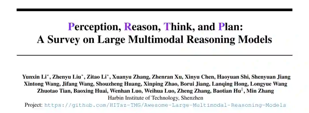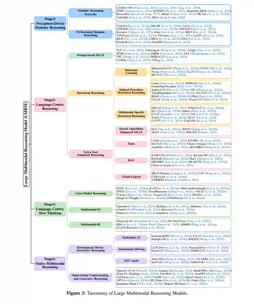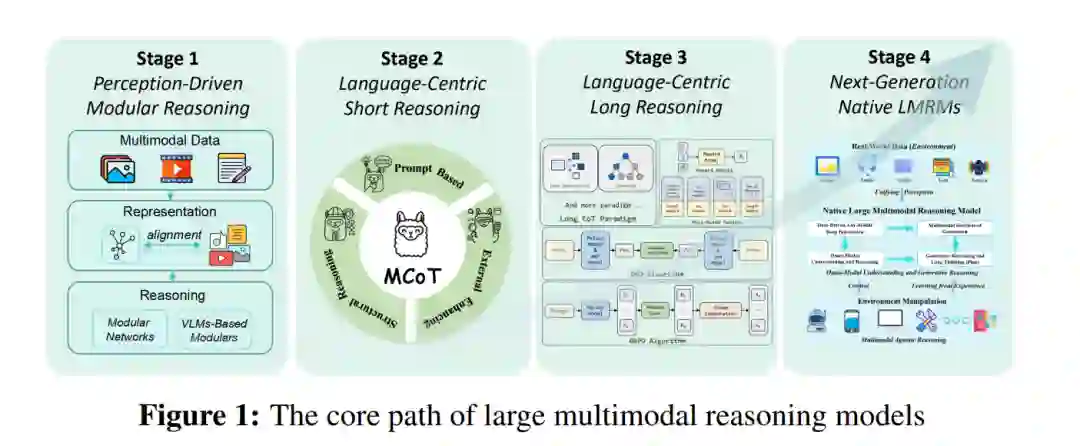 在哲学与人工智能领域,推理被广泛认为是智能行为的基石(Kahneman, 2011;Su 等,2024;de Winter 等,2024;Bi 等,2025)。它不仅使智能体能够适应性地响应环境,还能够进行逻辑推断、知识泛化及在复杂情境中作出决策。随着人工智能系统越来越多地与动态、不确定且多模态的环境交互,能否在多变情境下进行正确推理,已成为实现稳健且具适应性智能的关键(Yang 等,2025a;Christakopoulou 等,2024)。 在此背景下,大型多模态推理模型(Large Multimodal Reasoning Models,LMRMs)作为一个前沿方向逐渐显现出其潜力(Wang 等,2024k;Zhang 等,2024c;Yin 等,2023)。这类模型融合文本、图像、音频与视频等多种数据模态,展现出包括逻辑演绎、因果推理、类比映射与长程思维等在内的复杂推理能力。其核心目标是实现全面的感知、精准的理解与深层的推理,从而支撑多样化环境中的决策过程。 多模态推理研究发展迅速。早期研究依赖于以感知驱动的模块化流程,而近期进展则利用大语言模型统一多模态理解与推理(Huang 等,2023b;Driess 等,2023)。指令微调(Liu 等,2023a)与强化学习(DeepSeek-AI 等,2025)进一步提升了模型的推理表现,使其更接近类人的深思熟虑行为。尽管如此,多模态推理仍是大型多模态模型的核心瓶颈,其在泛化能力、推理深度以及类代理行为方面仍存在明显限制(Yue 等,2024;Zhang 等,2024f;Liu 等,2024f)。 已有综述主要聚焦于多模态大语言模型或以语言为中心的推理方法分析,尚缺乏对近期强化学习增强的多模态推理技术及LMRMs技术前景的系统分析。因此,多模态推理领域亟需一个连贯的框架,以理解其发展演变及未来方向。本文正是为填补这一空白,提供了一份涵盖从早期模块化设计到先进LMRMs的完整技术路线图的全面综述与分析。 具体而言,我们提出了一个结构化的多模态推理发展路线图(见图2),分为三个阶段: * 感知驱动的模块化推理:推理隐含在任务特定模块中; * 以语言为中心的短程推理(System-1):借助提示工程与结构化的短程思维链(CoT),实现初步的多模态推理; * 以语言为中心的长程推理(System-2):通过扩展的推理链与强化学习,支持长期思维、规划与类代理行为。