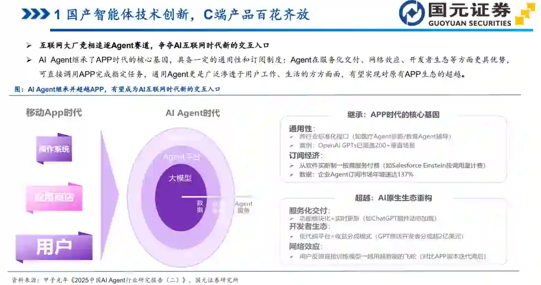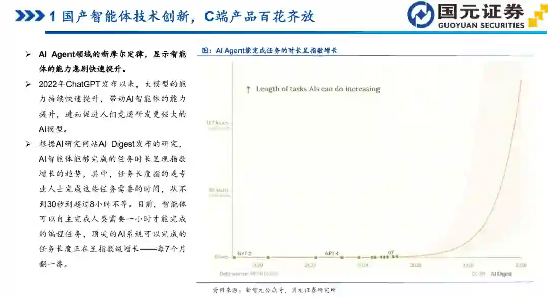 AI Agent领域的新摩尔定律, 显示智能体的能力急剧快速提升。 2022年ChatGPT发布以来, 大模型的能力持续快速提升, 带动AI智能体的能力提升, 进而促进人们竞逐研发更强大的AI模型。 根据AI研究网站AI Digest发布的研究,AI智能体能够完成的任务时长呈现指数增长的趋势, 其中, 任务长度指的是专业人士完成这些任务需要的时间, 从不到30秒到超过8小时不等。 目前, 智能体可以自主完成人类需要一小时才能完成的编程任务, 顶尖的AI系统可以完成的任务长度正在呈指数级增长——每7个月翻一番。