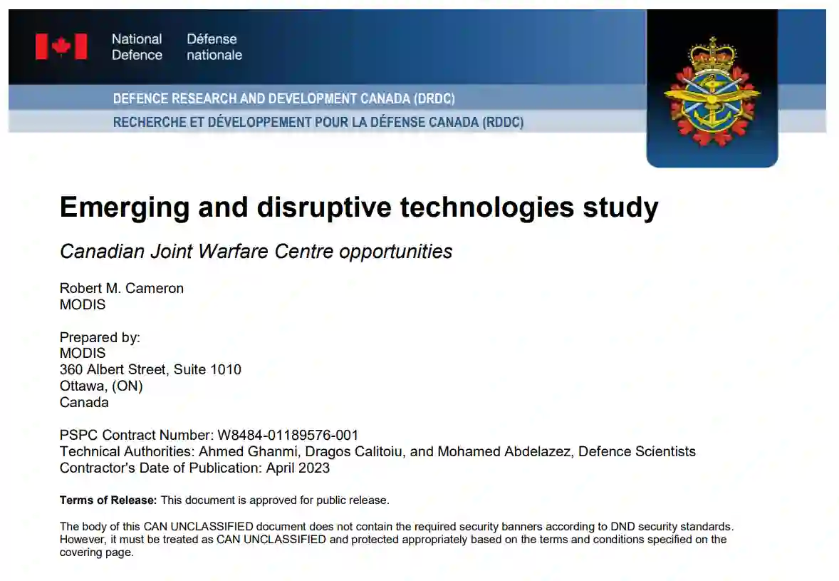 1.加拿大联合作战中心的部分职责是支持加拿大空军的联合能力发展。为加拿大空军开发的能力必须包括可能破坏部队指挥和控制的新兴技术。盟国和工业界对新兴技术和颠覆性技术表现出了极大的兴趣,认为这些技术将推动作战行动发生不可避免的变化。加拿大联合作战中心的联合作战中心科学处已指示进行这项研究,以确保未来作战环境中预期的新兴和颠覆性技术成为审查新的指挥与控制概念的一部分。