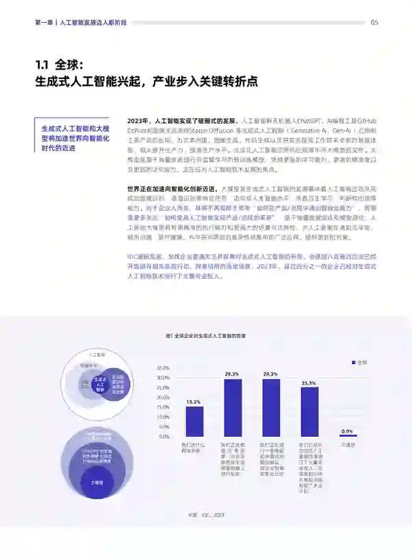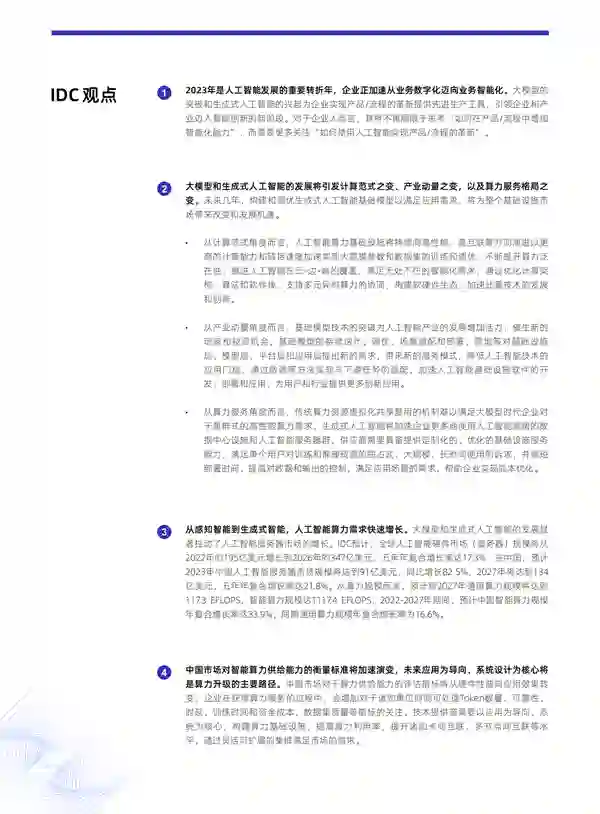 2023年,由ChatGPT引爆的新一轮人工智能热潮,开启了由大模型驱动的AIGC时代。IDC调研显示,67%的中国企业已经开始探索AIGC在企业内的应用机会或已经开始进行资金投入。 中国企业对生成式人工智能的态度 《报告》指出,当前在AIGC的带动下,人工智能计算力技术及应用趋势发生了较大的变化,体现为“三变: 一是计算范式之变。大模型和AIGC的发展加速了更高计算性能、更快互联性能的算力基础设施建设,推进人工智能在云-边-端的覆盖。此外,伴随应用场景多样性,底层基础设施呈现多元化发展。 二是产业动量之变。AIGC可重构现有的工作方式,在内容创作、自动驾驶、零售、医疗等诸多领域改变着人们的生活和生产方式,同时也带来更大的市场机会。算力、算法、应用、服务等诸多产业变量将成为创新的加速器,在算力生态链上的各个环节催生出新的玩家。 三是算力服务格局之变。由于基础大模型的本地训练成本不菲,企业将更多地使用已有的人工智能数据中心设施和生成式AI服务器集群,这将为算力服务市场带来新机会。算力服务供应商要能够提供定制化的基础设施服务能力,满足单个用户对训练和推理资源的独占式、大规模、长时间使用的诉求,同时帮助用户实现成本控制。 ** “以应用为导向、系统为核心”是算力升级新路径**