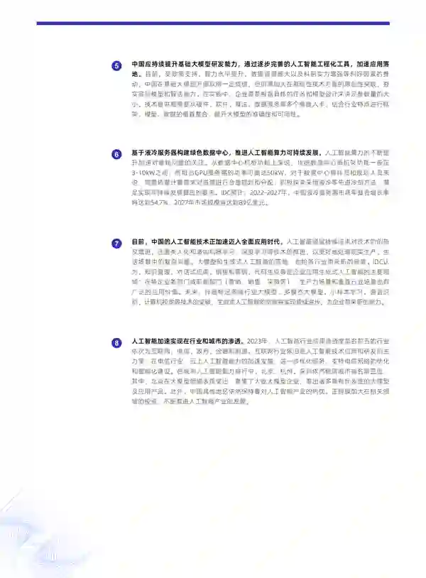 大模型和AIGC的发展提升了智能算力需求,给计算市场带来了发展机遇,同时也带来了算力紧缺等挑战。对此,《报告》认为,面对单芯片算力瓶颈、算力紧缺等问题,中国市场对于智能算力供给能力的衡量标准将发生变化——评估指标将从硬件性能向应用效果转变,用户在获得算力服务的过程中,会更加以应用为导向进行综合考量,增加对于诸如单位时间可处理Token数量、可靠性、时延、训练时间和资金成本、数据集质量等指标的关注。 针对这一转变,《报告》指出,算力供应商需要“以应用为导向、系统为核心”,构建算力基础设施平台,提高算力利用率,提升诸如卡间互联、多节点间互联等水平,支持灵活稳定扩展和弹性容错,积极打造通用的人工智能软件和硬件平台,以先进的系统性能力满足市场的应用需求。也就是说,与其过分关注单一芯片的性能强弱,不如根据人工智能业务场景需求,设计更具针对性的算力系统,实现整体性能最优。 具体内容如下: