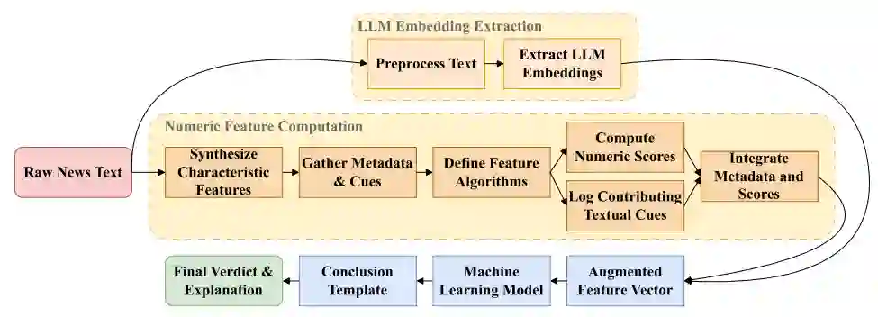 当前假新闻已成为全球性严峻挑战,社交媒体快速传播错误信息的能力加剧了这一问题。本文提出基于大语言模型(LLM)能力的新型特征计算流程构建方法,应对假新闻检测的紧迫挑战。核心目标在于优化可疑文本属性转化为分类适用数值向量的过程,从而填补系统整合语言线索与深度上下文嵌入的研究空白。在英语(FakeNewsNet)和乌克兰语(真假新闻)数据集上的实验表明:该方法以88.5%(英语)和86.7%(乌克兰语)准确率超越四个基线模型。关键发现显示:将复述比率、情感比率等数值指标与LLM嵌入结合,可提升欺诈文章检测召回率,较标准技术平均提高2-3个百分点。这些结果表明所提特征计算流程在保持模型决策透明度的同时显著提升检测精度。研究最终强调:系统化设计的数值特征对LLM嵌入的补充至关重要,为构建更可靠、适应性强且可解释的假新闻检测系统指明路径。