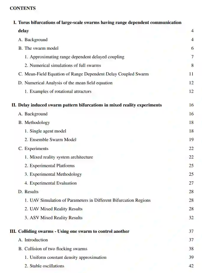 在本报告中,我们考虑了三个主要议题,这些议题涉及突发自组织蜂群的开放问题。首先,我们通过研究其分叉结构,考虑在存在范围相关的通信网络的情况下,蜂群的稳定性如何作为系统参数的函数发生变化。然后,我们看了目前的蜂群模式的混合现实实验来验证以前的分叉分析。最后,我们展示了一个蜂群如何通过将两个蜂群碰撞在一起而改变另一个蜂群的行为。