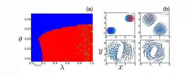 最后,我们研究了具有非线性相互作用的两个蜂群的碰撞,并特别侧重于预测这种蜂群何时会结合成一个群体。与完整的散射图不同的是,它取决于一组特定的初始条件是否属于集群的高维吸引盆地(一般来说是一个困难的问题),我们集中于预测在近乎正面碰撞时维持一个集群所需的最小耦合。通过注意到最终形成碰撞群,最初是围绕一个密度近似恒定的共同中心旋转,我们能够将临界耦合的问题转化为确定均值场近似的极限循环状态的稳定性。我们的分叉分析与许多智能体的模拟结果一致。尽管我们的分析直接涉及到软核内互动的蜂群,但只要智能体之间的非线性力有一个有限的范围,基本方法可以很容易地扩展到更广泛的模型。此外,提高我们分析的准确性的一个直接方法是超越均匀密度假设,用具有一般相互作用的蜂群状态的精确稳态密度来取代它。除此之外,下一步的改进将是直接包括密度动力学,这可能为控制蜂群碰撞提供进一步的见解,包括在其他设置中,如蜂群。尽管如此,这项工作为理解和分析非线性蜂群碰撞迈出了重要的一步。