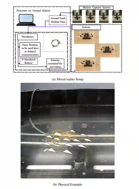 在这项工作中,我们通过提出一个混合现实的实验框架来解决工程化蜂群系统的这些实验挑战,作为走向全面实验验证的第一个重要步骤。混合现实是在模拟和现实世界中同时使用虚拟机器人和真实机器人,它保留了物理机器人的关键特征,同时能够扩展到更多数量的智能体,或更大的工作空间,而不受到资源的物理限制。混合现实带来的好处包括:能够与大量的机器人一起工作,并确保人类机器人互动的安全性。由于所需的机器人数量减少,使用混合现实技术的实验成本较低,同时还能从几个真实的机器人中引入现实世界的复杂动态。混合现实是向理论研究结果的全面实验验证迈出的重要第一步。此外,混合现实框架提供了对理论和改进实验设计的额外见解的机会。