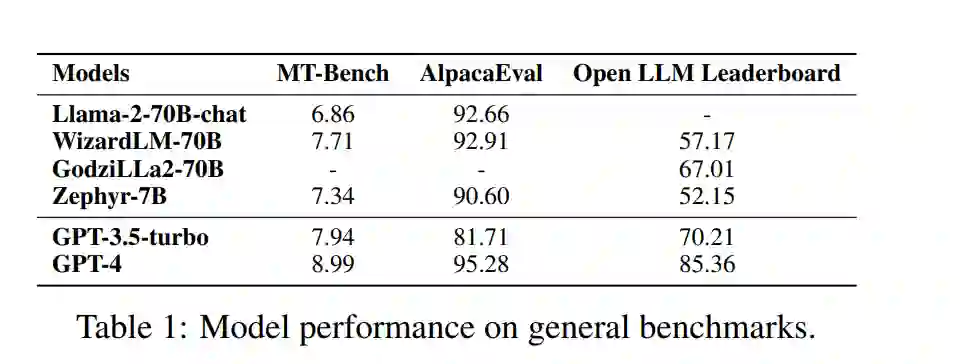 Llama-2-70B(Touvron et al., 2023b)是一款杰出的开源LLM,已在庞大的两万亿令牌数据集上进行预训练。它在各种通用基准测试中展示了卓越的结果。当进一步使用指令数据进行微调时,Llama-2-chat-70B变体在一般对话任务中表现出增强的能力。特别是,在AlpacaEval中,Llama-2-chat-70B取得了92.66%的胜率,超过了GPT-3.5-turbo的10.95%。然而,GPT-4仍然是所有LLM中的顶尖表现者,其胜率为95.28%。另一个较小的模型Zephyr-7B(Tunstall et al., 2023)使用了蒸馏直接偏好优化(Rafailov et al., 2023a),在AlpacaEval中与70B LLM取得了相当的结果,胜率为90.6%。它甚至在MT-Bench上超过了Llama-2-chat-70B,得分为7.34对6.86。此外,WizardLM-70B(Xu et al., 2023a)经过使用大量具有不同复杂度的指令数据的微调。它作为最高得分的开源LLM在MT-Bench上脱颖而出,得分为7.71。然而,这仍然略低于GPT-3.5-turbo(7.94)和GPT-4(8.99)的得分。尽管Zephyr-7B在MT-Bench上表现出色,但在开放LLM排行榜上得分仅为52.15%。另一方面,GodziLLa2-70B(Philippines, 2023),一款结合了各种专有LoRAs(来自Maya Philippines 6)和Guanaco Llama 2 1K数据集(mlabonne, 2023)与Llama-2-70B的实验模型,在开放LLM排行榜上取得了更具竞争力的67.01%的得分。这一表现与GPT-3.5-turbo(70.21%)相当。然而,两者都明显落后于GPT-4,后者以85.36%的高分领先。UltraLlama(Ding et al., 2023)利用了具有增强多样性和质量的微调数据。它在其提出的基准测试中与GPT-3.5-turbo的表现相匹配,而在世界和专业知识领域则超越了后者。 大模型发展趋势
