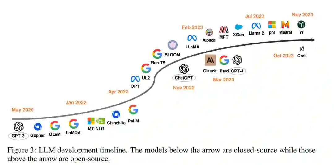 为了促进开源LLM的研究,Meta发布了Llama系列模型(Touvron et al., 2023a,b年)。从那时起,基于Llama的开源模型开始爆炸性地出现。一个代表性的研究方向是使用指令数据对Llama进行微调,包括Alpaca(Taori et al., 2023年)、Vicuna(Chiang et al., 2023年)、Lima(Zhou et al., 2023b年)和WizardLM(Xu et al., 2023a年)。正在进行的研究还探索了提高基于Llama的开源LLM的代理(Xu et al., 2023d年;Zeng et al., 2023年;Patil et al., 2023年;Qin et al., 2023b年)、逻辑推理(Roziere et al., 2023年;Luo et al., 2023a,c年)和长文本建模(Tworkowski et al., 2023年;Xiong et al., 2023年;Xu et al., 2023b年)能力。此外,除了基于Llama开发LLM之外,还有许多努力投入到从零开始训练强大的LLM,例如MPT(团队,2023年)、Falcon(Almazrouei et al., 2023年)、XGen(Nijkamp et al., 2023年)、Phi(Gunasekar et al., 2023年;Li et al., 2023e年)、Baichuan(Yang et al., 2023a年)、Mistral(Jiang et al., 2023a年)、Grok(xAI,2023年)和Yi(01ai,2023年)。我们相信,开发更强大、更高效的开源LLM,以民主化封闭源LLM的能力,应该是一个非常有前景的未来方向。