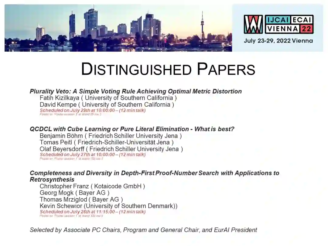近日,人工智能领域顶会 IJCAI 揭晓 2022 年杰出论文获奖名单,今年共有三篇论文获得杰出论文(Distinguished Papers)奖项。 获奖团队分别来自南加州大学、耶拿大学、维也纳工业大学、拜耳股份公司、南丹麦大学等机构。