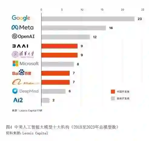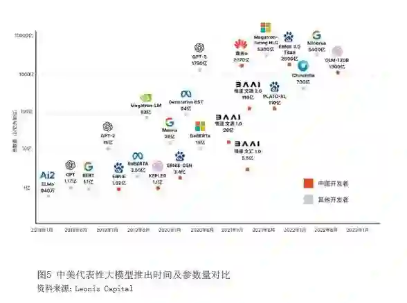 国内在人工智能大模型研究上具备良好的基础 从2018年至今推出大模型数量来看,美国头部科技企业如谷歌、Meta、OpenAI、微软等在人工智能大模型领域积累深厚,但我国研究机构在全球前十大排名中也占据四个席位,包括智源人工智能研究院、清华大学、百度、阿里巴巴(见图4)。 我国与国外最领先的技术相比仍有2—3年差距 从大模型的参数量来看,美国人工智能研究机构总是率先取得突破,比如谷歌2017年提出Transformer模型奠定了大模型的底层模型基础,OpenAI的GPT系列持续引领潮流;中国人工智能大模型虽然具备追赶的能力,但追赶的过程需要花费1—2年时间,此后在模型技能上仍需时间打磨,完全拉齐效果大概需要2—3年时间(见图5)。例如,OpenAI于2019年1月推出拥有15亿参数量的GPT-2大模型,而国内直至2021年1月由智源人工智能研究院研发出26亿参数量的大模型——悟道文源1.0。