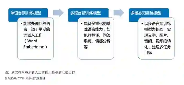 阶段二,模态支持演进:从单一模态到多模态 从支持的模态来看,人工智能大模型先后经历了单语言预训练模型、多语言预训练模型、多模态预训练模型三个阶段,模型能力持续升级(见图3)。