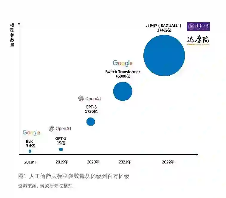 人工智能大模型的定义和优势 人工智能大模型即基础模型(Foundation Model)(《On the Opportunities and Risk of Foundation Models》,2021.08,李飞飞等100位学者联合发表),国际上称为预训练模型,指通过在大规模宽泛的数据上进行训练后能适应一系列下游任务的模型。 相较于小模型(针对特定场景需求、使用人工标注数据训练出来的模型),大模型主要有以下三点优势: 涌现能力。通过简单的规则和相互作用,大模型能够有效集成自然语言处理等多项人工智能核心技术,并涌现出强大的智能表现,将人工智能的能力从感知提升至理解、推理,甚至近似人类“无中生有”的原创能力。 适用场景广泛。人工智能大模型通过在海量、多类型的场景数据中学习,能够总结不同场景、不同业务下的通用能力,摆脱了小模型场景碎片化、难以复用的局限性,为大规模落地人工智能应用提供可能。 研发效率提高。传统小模型研发普遍为手工作坊式,高度依赖人工标注数据和人工调优调参,研发成本高、周期长、效率低。大模型则将研发模式升级为 大规模工厂式,采用自监督学习方法,减少对人工标注数据的依赖,显著降低人力成本、提升研发效率。人工智能大模型的技术演进趋势 阶段一,训练数据演进:从追求规模到重视质量 追求规模。2018年以来,以BERT、GPT-3等为代表的人工智能大模型的成功使人们认识到通过提升参数规模、训练数据量有助于显著提升人工智能的智能水平,引发了大模型研发的军备竞赛,大模型参数呈现数量级增长,充分享受算法进步下的数据规模红利。 人工智能大模型的发展也经历预训练模型、大规模预训练模型、超大规模预训练模型三个阶段,参数量实现从亿级到百万亿级突破(见图1)。