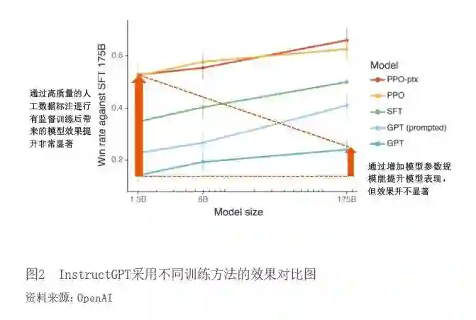 重视质量。伴随大模型参数的持续扩大,训练数据的质量对模型表现的重要性愈发凸显。OpenAI对其研发的InstructGPT模型进行实验发现:随着参数量增加,模型性能均得到不同程度的提高;利用人工标注数据进行有监督的微调训练后的小参数模型,比100倍参数规模无监督的GPT模型效果更好。未来,提升大模型的训练数据质量或许比提升数据规模更为重要,人工标注数据仍有其存在的价值和意义,相关产业链的发展也值得重视(见图2)。