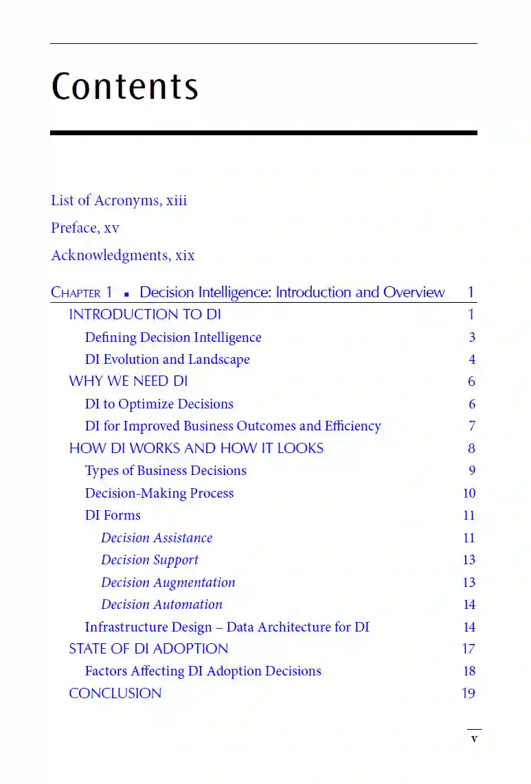 本书揭示了人类决策的局限性,探讨了如何使用人工智能(AI)来优化决策,以提高业务结果和效率,以及展望了决策智能(DI)可以对社会做出的重大贡献和它可能提出的道德挑战。 https://www.routledge.com/Decision-Intelligence-Human-Machine-Integration-for-Decision-Making-Human-Machine/OCallaghan/p/book/9781032384108 从用于设计自主智能代理的理论和概念,到支持DI系统的技术,以及公司使用决策构建模块构建DI解决方案的方式,使企业能够使AI民主化,本书提出了一个令人印象深刻的框架,以整合人工智能和人类智能,以实现不同类型的商业决策的成功。 本书充满了DI应用的案例研究,以及对该技术的社会影响的更广泛的讨论,《决策智能:用于决策的人机集成》吸引了人工智能和数据科学的学生以及考虑采用DI的企业。 想象一下,你正在做人生中最重要的决定之一,需要对信息进行彻底的分析。不幸的是,你没有时间收集所有数据并进行深入研究。相反,你可以根据朋友的建议在手机上安装一个价格合理的应用程序。该应用程序允许你用自然语言提出问题,并使用高度复杂的人工智能模型,根据对大量数据的分析提供快速答案。当你问一个问题时,该应用程序确定哪些数据最相关,收集数据,选择合适的模型和分析类型,执行分析,做出预测,评估结果,最后以简要报告、可操作的见解和建议的形式为你提供答案。你现在可以利用大数据和人工智能的力量,以最有效的方式做出最优的决策,而不是仅仅基于直觉做出重要的决策。这听起来像是科幻小说的情节,但事实并非如此。帮助我们更好更快地做出决定的前沿技术系统今天正在成为现实——这一新兴学科被称为决策智能(DI)。在很大程度上,DI是人工智能的应用,以提高决策的质量和准确性,同时使决策过程更有效。本书的目的是帮助读者了解DI这一新兴学科。他们将探讨与个人和组织决策有关的各种概念,包括人类和机器智能体如何做决策,在构建依赖注入系统时使用了什么技术、工具和技术,如何为采用依赖注入做好组织准备,以及如何利用依赖注入做出道德上最优的决策。本书基于对多个领域的数百份研究和文献的分析,其中包括决策科学、行为科学、管理决策、博弈论、系统思维、决策支持系统、决策建模、商业智能、行为经济学、人工智能和机器学习等。