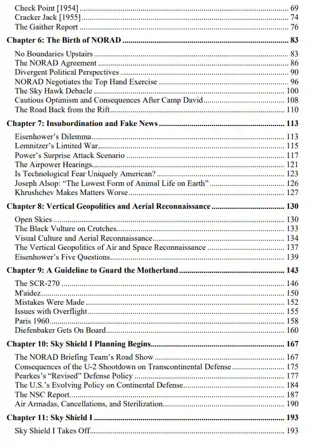第八章深入分析艾森豪威尔政府的空基监视体系——格雷厄姆所称"疏离化垂直监控"(2004:21)。白宫通过"去身体化"的军事凝视实施空中侦察,发现苏联战力弱于预期。本章同时揭示西方地缘政治中盛行的视觉中心主义:国家决策依赖"硬情报",即来自垂直监控的视觉证据。间谍飞机提供的不仅是"上帝视角",更衍生出空中监视的垂直地缘政治维度。