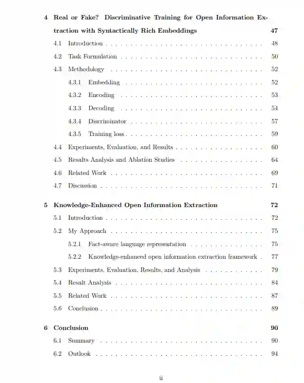 本文旨在解决OIE早期方法的上述缺点。在这项研究中,我只研究了神经OIE方法,因为它们优于先前的基于规则的系统,并解决了基于规则的系统中的错误传播问题。在利用最先进的(SOTA)深度学习方法的同时,我给出了解决早期方法局限性的新方法。此外,我还研究了将知识图(KGs)中的事实知识合并到神经OIE模型中是否可以提高OIE方法的性能。首先,我提出了三种用于OIE方法序列标签的创新训练程序,以消除模型上OIE数据集中标签频率不均匀造成的模型偏差。其次,我避免了在事实中创建多余的标记,并通过提供方法显式地指导模型使用词汇表或输入文本中的术语,提高了模型创建隐式事实的能力。这种策略实际上大大减少了重复出现的令牌的数量。此外,当使用这种策略时,模型从原始短语中重复较少的标记,而从词汇表中引入更多的标记,这意味着具有更好的生成隐含事实的能力。第三,我提出了一种最大化依赖树拓扑提供的语法信息的方法。使用依赖树的结构,我计算了输入文本标记的语法丰富的向量表示。第四,我提出了一个用于序列标记和序列生成OIE技术的知识增强OIE框架,该框架基于在预训练语言模型(PLMs)中嵌入知识的最新成果。经过彻底的测试,我确认知识增强的OIE框架提高了OIE模型的性能。最后,为神经OIE模型训练提供了一种独特的判别策略。