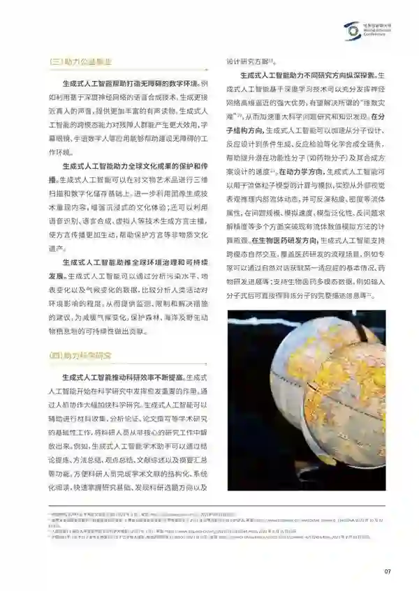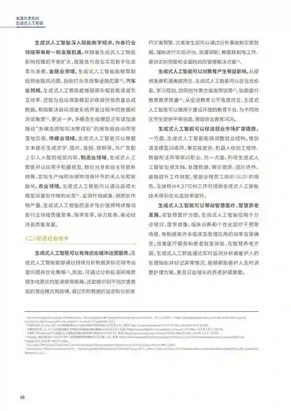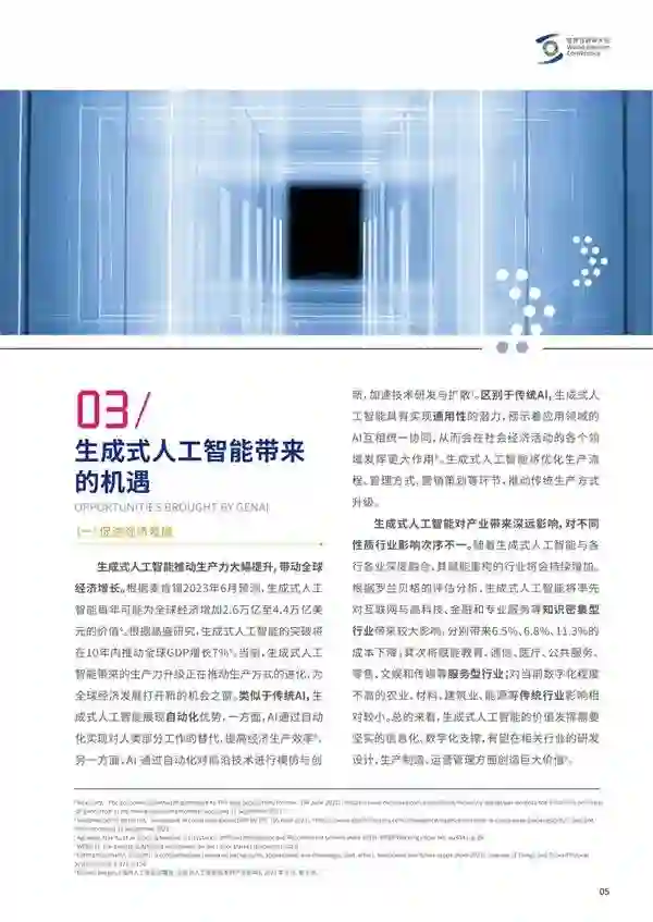来源:世界互联网大会 近日,在乌镇召开的人工智能赋能产业发展论坛上,来自企业、研究机构、国际组织等各方的代表,共同发布了《发展负责任的生成式人工智能研究报告及共识文件》。 回顾人工智能60余年的发展历程,技术突破不仅会创造发展机遇,也会带来相应的挑战。统筹人工智能发展和治理逐渐成为全球共识,自2016年以来,全球多个国际组织、国家、地区及产业界,积极探索人工智能发展与治理路径,已经形成了系列共识原则、治理要求、实践范式等。考虑到人工智能尚处在快速发展的过程中,相关工作仍需要持续推进。 信息技术革命在进入人工智能阶段之后,以生成式人工智能为代表的技术,又取得了长足的进步和发展。如《研究报告及共识文件》中所明确指出的那样: 其一,在“模型、数据、算力”等三大要素持续迭代和高速演进的推动下,人工智能不断在工程维度的发展和应用中,实现快速突破。就全球范围的发展情况来看,Transformer为主的基础模型依托相关研究主体的长期持续投入,通过ChatGPT、Stabel Diffusion、BLIP-2等,在大语言模型、视觉生成模型、多模态模型等细分领域,持续实现模型能力的跃升。这种跃升的主要体现,是参数规模进入1000亿量级,处理复杂自然语言能力因此呈现显著发展;在数据领域,多场景的大模型预训练数据集不断涌现,研究机构形成了通过发布微调数据集方式,提升预训练用数据集的效能;合成数据解决训练数据资源可持续性的探索也取得了较为显著的成效;算力芯片和架构的持续迭代,在训练效能、云边端算力效能优化等方面,对生成式人工智能的发展提供了有效的支撑。 其二,应用前景催生了开源开放驱动生成式人工智能生态的迅速发展,整体趋向繁荣发展。从应用场景看,开源生态与开放驱动成为当下推动人工智能生态发展的主基调,模型迭代优化、研发门槛降低、缩短初创成本等,成为各方广泛认知的主要优势。与此相应的,在ChatGPT的刺激下,生成式人工智能的开发者社区迅速涌现,成为支撑和推动相关技术与应用发展的主渠道。Hugging Face、华为云AI Gallery、阿里巴巴、FlagOpen飞智、百度的飞桨星河等社区凭借各自比较优势,在其中发挥了至关重要的作用。 其三,生成式人工智能的阶段性高速发展再度激发了人们对于发展通用式人工智能的勇敢想象与积极探索。如《研究报告及共识文件》指出的那样,由于生成式人工智能的这一轮突破,尤其是其中与多模态方向发展相一致的发展,催生了人们新的想象与探索:人们预期,伴随着多模态生成模型技术的突破,能够更好地理解和处理复杂的现实场景,或许将带来更多的想象空间,比如可以探索将多模态生成模型与机器人技术结合等方式,继而以某种形式尽可能趋近模仿人类感知复杂世界能力的呈现。 很自然的,生成式人工智能带来的机遇和挑战,同步存在: 从积极的角度看,生成式人工智能可能带来的经济增长前景,日趋明朗。根据麦肯锡2023年6月的乐观预测,生成式人工智能每年可能为全球经济增加2.6万亿至4.4万亿美元的价值。根据高盛研究,在满足增长条件的情况下,生成式人工智能的突破将在10年内推动全球GDP增长7%。对生成式人工智能以及通用式人工智能未来发展前景的合理展望,有助于人们确信人类的生产活动和满足特定要求的服务行业,未来均可能面临显著的增长前景,有理由保持乐观预期。 从生成式人工智能的可能应用场景来看,现代社会的基础服务体系可能获得有效赋能,预期城市运营管理、灾害救助与事故分析、实时预警与风险管理、定制化个性化的新型教育体系、新型就业岗位与就业机会、以及迫切需要得到实质性赋能的医疗和养老行业,均可能从人工智能的负责任发展中获得实质性的收益。此外公益事业中的无障碍数字环境建设、全球文化成果保护和传播,以及全球环境治理和可持续发展,也有希望从生成式人工智能的喷薄发展中得到全新的赋能与助力。作为高质量的“聪明”助手,生成式人工智能在助力科学研究中所具有的广阔前景,也同时日趋清晰地呈现。 客观而谨慎地看,生成式人工智能带来的风险挑战也是显而易见的,预先训练大模型时投喂的数据不可避免地存在缺陷,价值偏见、隐私泄露、数据污染等,如《研究报告及共识文件》所指出的那样,是已经被广泛察觉到的主要风险;算法模型的“幻觉”,虚假信息干扰,指向模型的网络攻击等,均揭示了人工智能发展带来的新型安全隐患和风险;此外,高速技术迭代带来的科技伦理失范以及人类社会发展失衡等问题,也日趋明显地成为各方必须共同关注,并探究治理方案的关键所在;在更广义的政治经济学分析框架中,生成式人工智能对数字劳动和能源损耗等领域的重大影响,也已经到了必须早日提上议事日程的时候,其后带来的发展,值得我们各方高度关注。 具体内容如下: